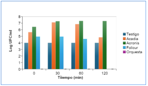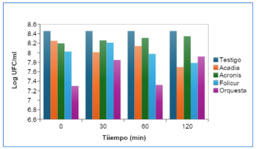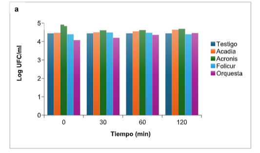 PS (Pseudomonas). Folicur® 25 EW afectó el crecimiento a partir de 120 min; Acadia Bio® y Acronis® no mostraron impacto; Orquesta® Ultra no permitió crecimiento en ningún tiempo.