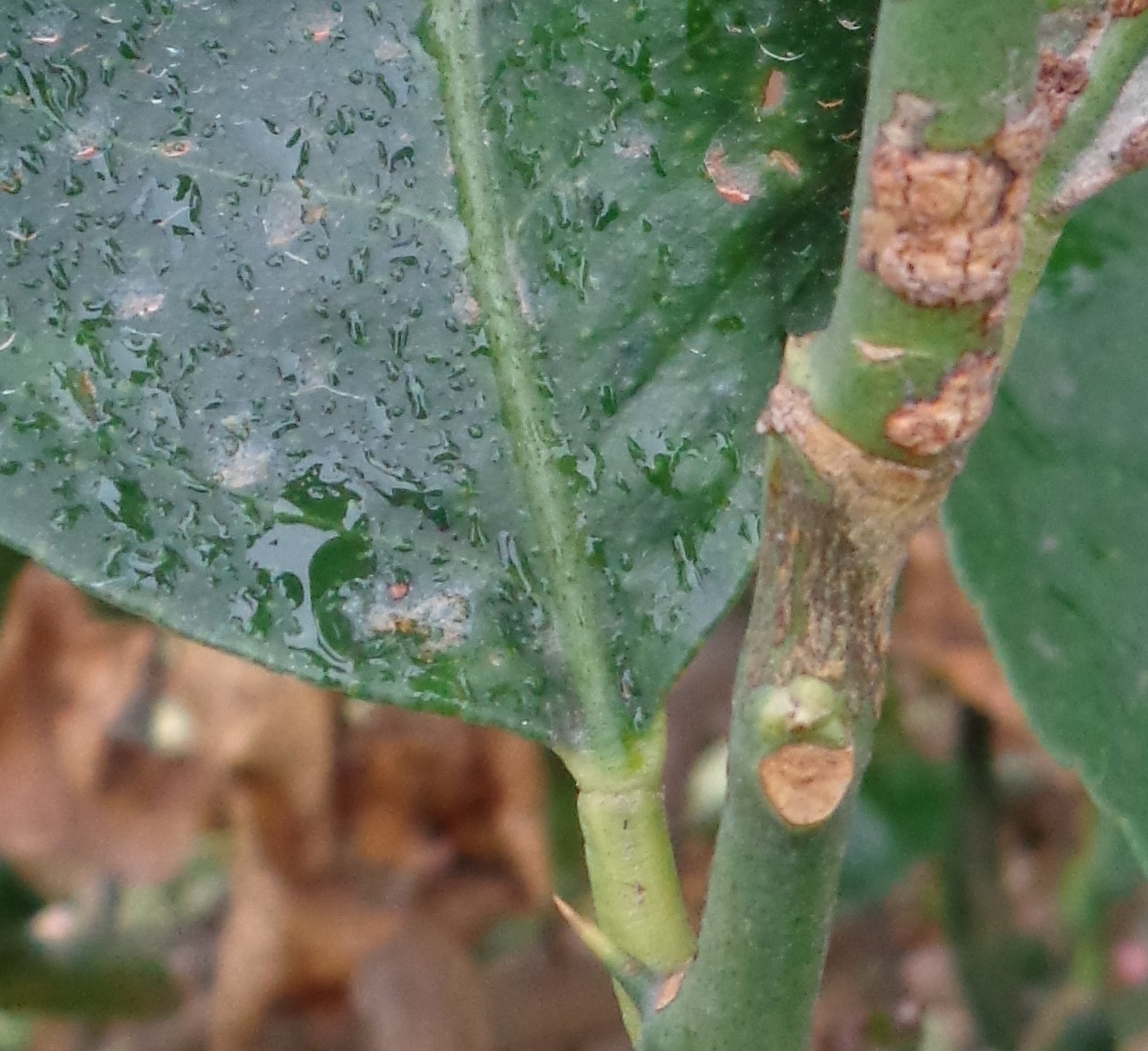 Las lesiones en las ramas son similares a las de las hojas pero más chatas y alargadas con un centro necrótico, y son más prominentes en las ramas viejas (Figura 8).