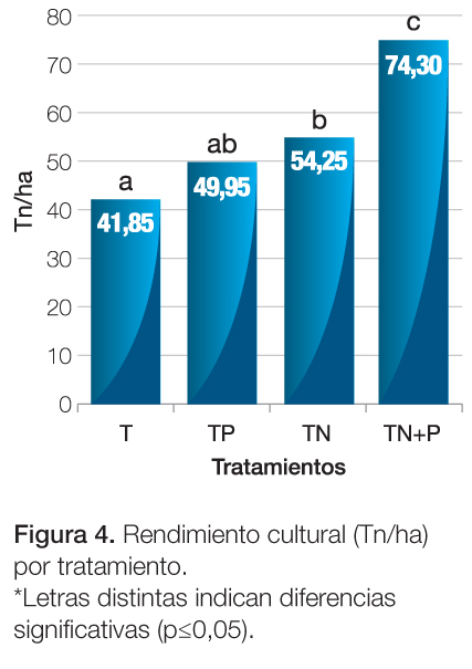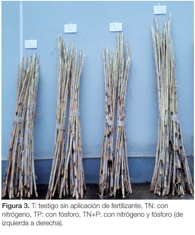 Los datos del ensayo muestran un incremento de producción de todos los tratamientos con respecto al testigo sin fertilizar. El tratamiento TP aumentó un 19% (sin diferencia significativa estadísticamente); el tratamiento TN, un 30%; y el tratamiento TN+P, un 78% con respecto al testigo sin fertilizar. Además el tratamiento con fósforo y nitrógeno mostró un incremento en producción del 37% con respecto a las cañas fertilizadas solo con nitrógeno, lo que se traduce en una ganancia de 20 t/ha cuando se fertiliza el cañaveral con nitrógeno y fósforo. Estos resultados revelan la magnitud de respuesta en producción que podrían lograrse en las áreas señaladas de contenido bajo y medio, si se incluyera el fósforo en el plan de fertilización de los productores localizados en estas zonas.