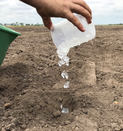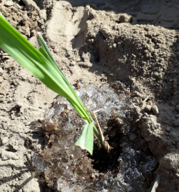 En T2 se aplicó un único riego con una lámina de 30 mm inmediatamente después de la implantación de los plantines. En T3 el hidrogel prehidratado se colocó en el fondo del pozo de plantación, a la dosis recomendada de 300 ml por planta. Luego, se taparon los plantines y se compactaron firmemente (Figura 3).