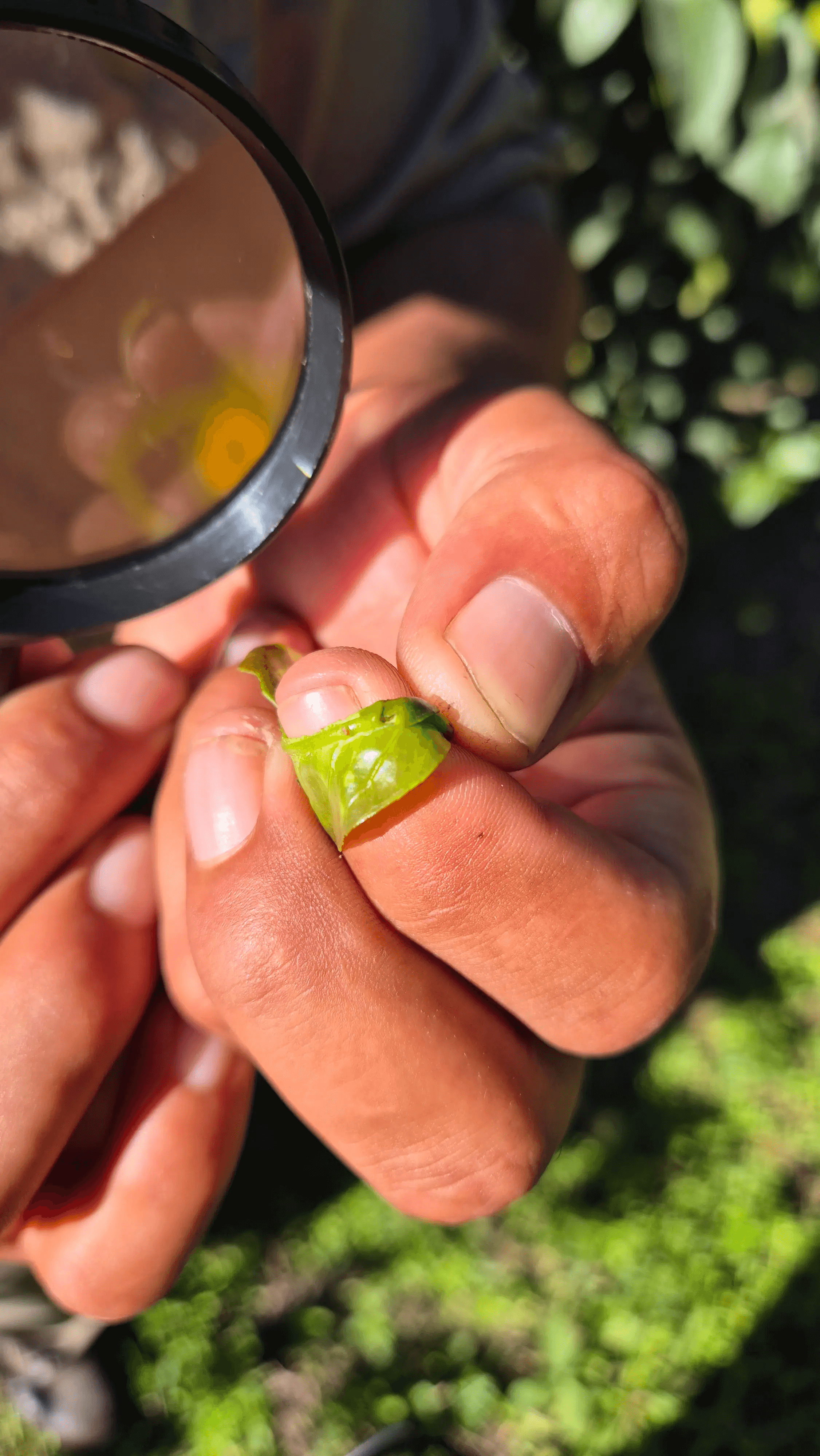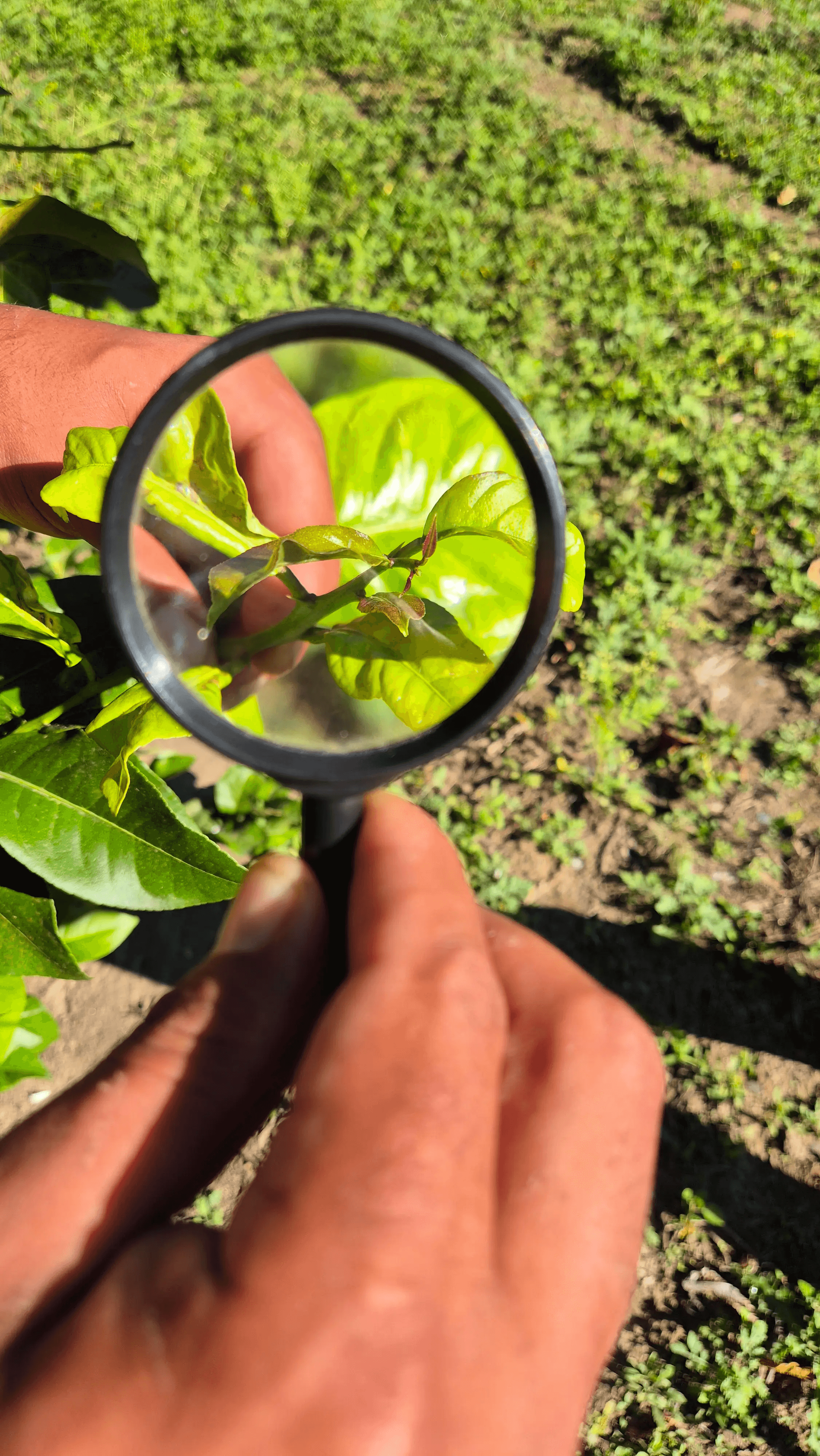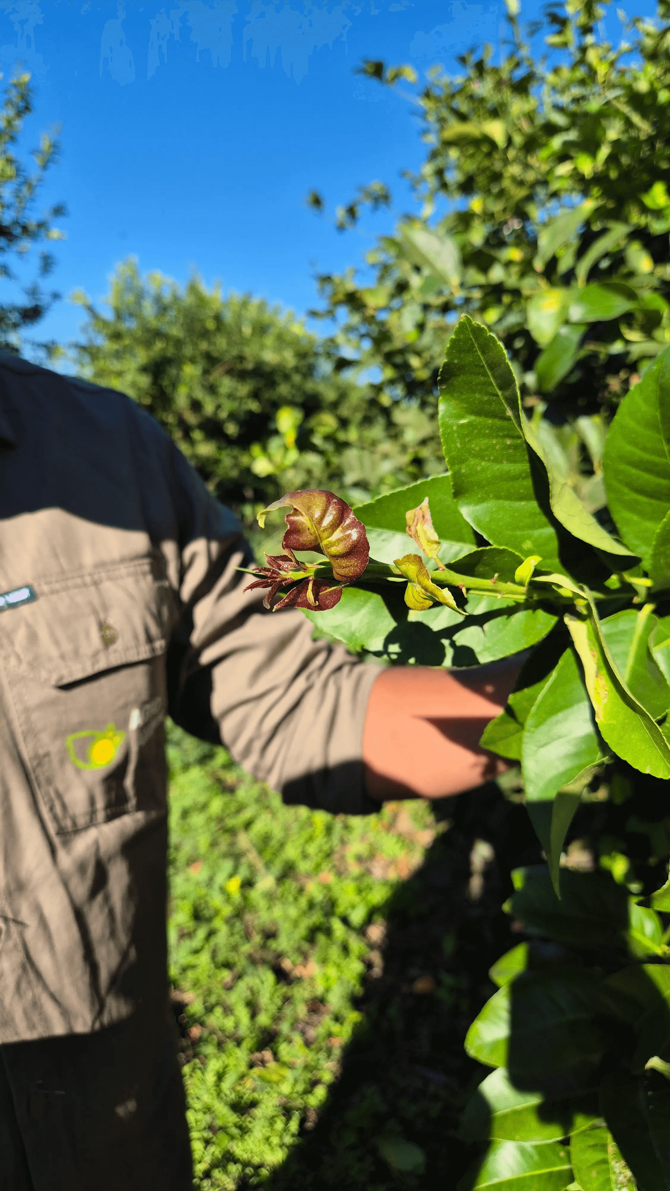 Hoy me toca revisar el lote desde temprano. Apenas llego, me calzo las botas, me ajusto la gorra, y con la lupa en mano salgo al campo. Sé lo que estoy buscando: adultos, ninfas y huevos de Diaphorina citri, insecto vector del HLB, o cualquier síntoma sospechoso de la enfermedad. Este monitoreo tiene más de una metodología; la de hoy es inspección visual: lo que ven nuestros ojos, ayudados por una lupa.