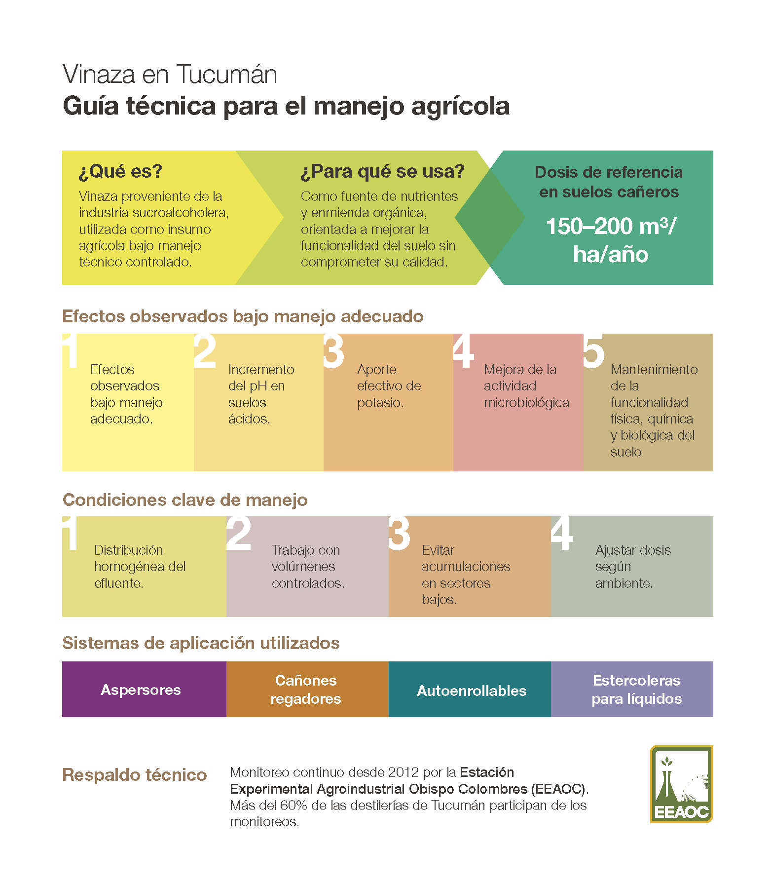 Desde 2012, la Estación Experimental Agroindustrial Obispo Colombres desarrolla monitoreos y ensayos sistemáticos para evaluar el uso agrícola de la vinaza en condiciones locales. Este trabajo permitió construir una base de datos provincial sostenida en mediciones a campo y análisis de laboratorio, con foco en distintos ambientes representativos de Tucumán.