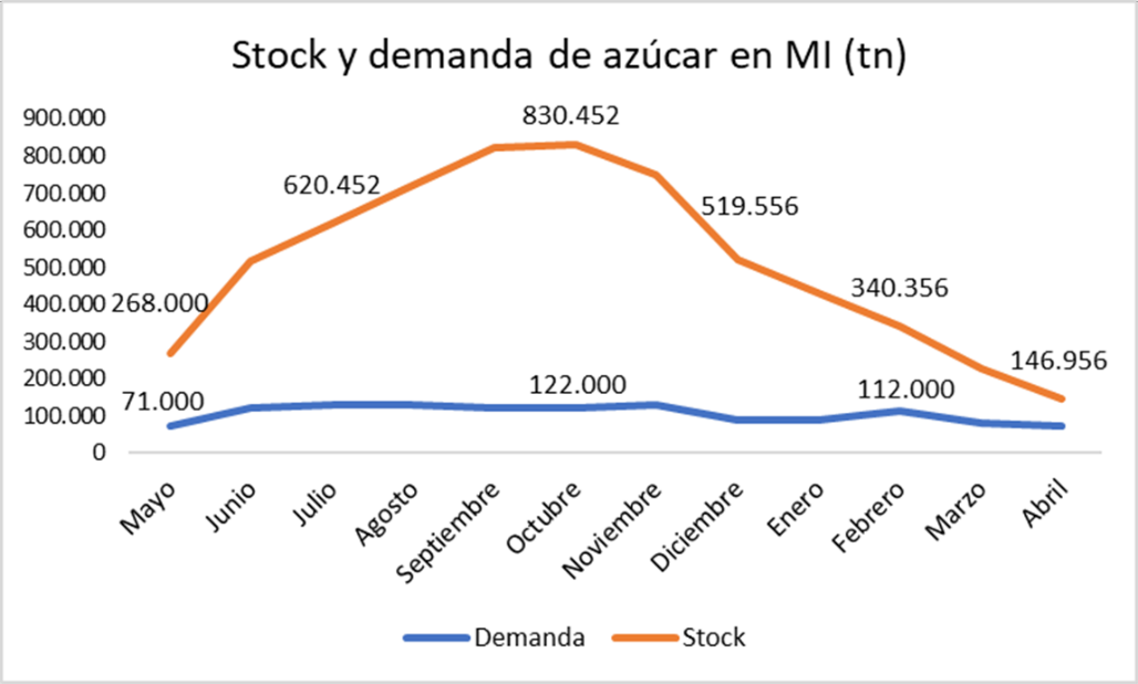 Al tratarse de una producción estacional de seis meses frente a una demanda del mercado interno distribuida a lo largo de todo el año, el stock de azúcar destinado a satisfacer esa demanda siempre es excedentario. La curva del stock en la Figura 1 refleja su evolución desde mayo 2025 (incluye saldo de existencia inicial y la producción de abril) hasta abril de 2026, frente a la curva de la demanda esperada, con un saldo final proyectado de 75.000 toneladas.